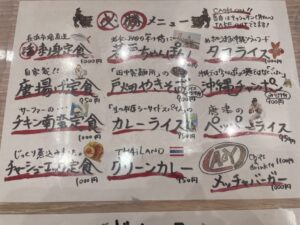 メニューは様々で、日替わり定食をはじめ、カレーや唐揚げ定食など、食欲をそそるメニューが豊富にありました。メニューは写真を掲載していますので、ぜひご覧ください。